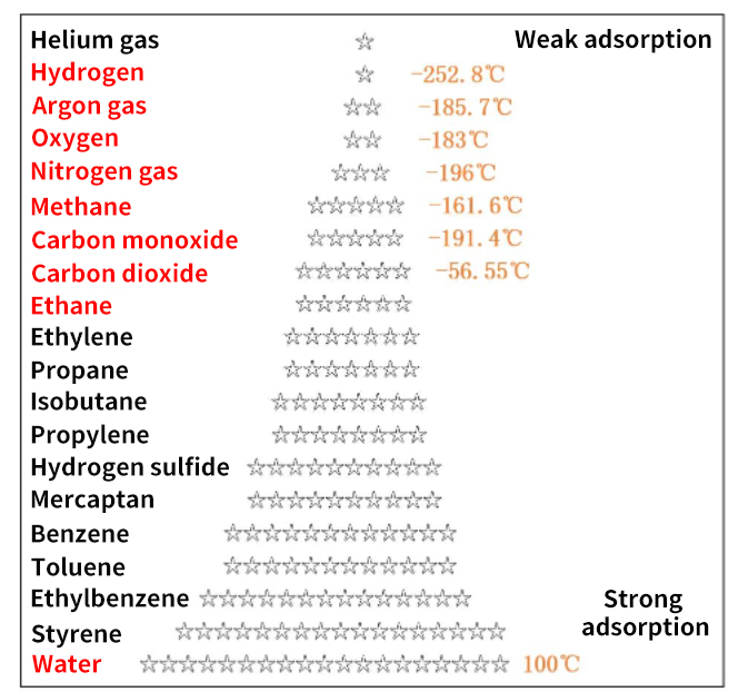 Adsorption process: It can be considered as a process of concentration or as a process of liquefaction. Therefore, the lower the temperature and the higher the pressure, the greater the adsorption capacity. For all adsorbents, the more easily liquefied (higher boiling point) gases adsorbed more, and the less liquefiable (lower boiling point) gases adsorbed lower.