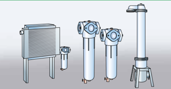 Different aftercoolers and water separators. The water separator can separate condensed water from compressed air by changing the direction and speed of the air flow.