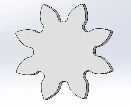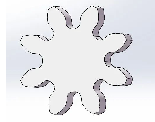 Fancheng method is widely used, but when the number of gear teeth is small, the intersection point of the addendum line of the tool and the meshing line will exceed the meshing limit point of the cut gear, and the root of the gear to be processed will be over Cutting, because the undercut part exceeds the meshing limit point, it does not affect the normal meshing of the gears, but the disadvantage is that it weakens the strength of the teeth. When such gears are used in heavy-duty occasions such as gearboxes, It is easy to break the gear teeth. The picture shows the model of the 2-die 8-tooth gear after normal processing (with undercut).