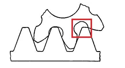 When manufacturing gears in this way, when the number of teeth is small, undercutting occurs, which affects the strength of the manufactured gears. What is undercutting means that the root has been cut. . . Note the red box in the picture: